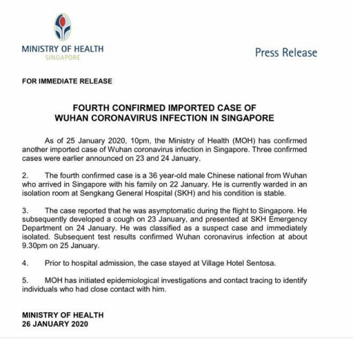 新加坡確認(rèn)第四例新型冠狀病毒病例