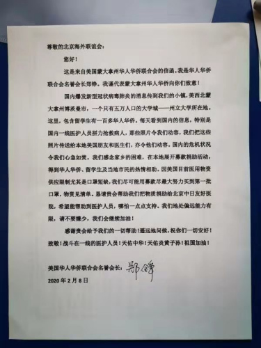 中國僑網(wǎng)2月11日電 近日,北京海外聯(lián)誼會收到美國蒙大拿州華人華僑聯(lián)合會來信,當(dāng)?shù)厝A僑華人、留學(xué)生以及民眾自發(fā)捐款購買到了一批口罩,希望通過北京海外聯(lián)誼會定向捐給中日友好醫(yī)院。
