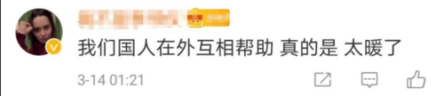很多網(wǎng)友在微博下留言,“我們國人在外互相幫助真是太暖了!” “真的是善良可愛的人”,還有網(wǎng)友感慨:中國人無論到了哪里,都能團(tuán)結(jié)一心共渡難關(guān)!