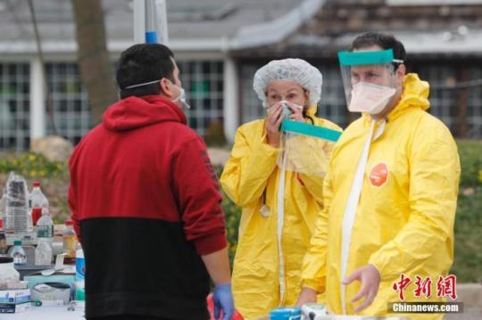 當(dāng)?shù)貢r(shí)間3月18日,美國(guó)紐約州拿騷縣的一處醫(yī)療中心戶外停車(chē)場(chǎng)正在進(jìn)行免下車(chē)新冠病毒檢測(cè),醫(yī)務(wù)人員工作交流。目前,紐約州有部分地點(diǎn)推行免下車(chē)新冠病毒檢測(cè),該測(cè)試需要通過(guò)預(yù)約評(píng)估方可到現(xiàn)場(chǎng)檢測(cè)。 中新社記者 廖攀 攝