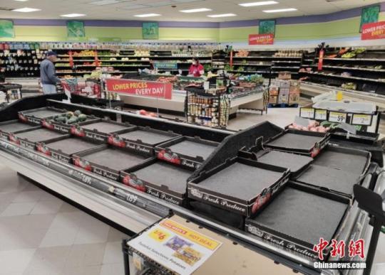 當(dāng)?shù)貢r(shí)間3月17日,美國(guó)舊金山灣區(qū)圣馬特奧縣一家超市的多種商品供不應(yīng)求。中新社記者 劉關(guān)關(guān) 攝