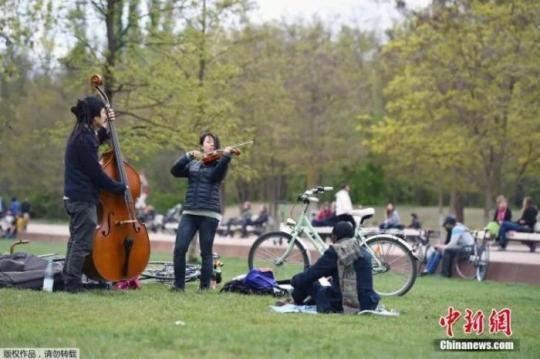 德國民眾公園綠地休閑 兩名音樂家奏樂獻(xiàn)藝。