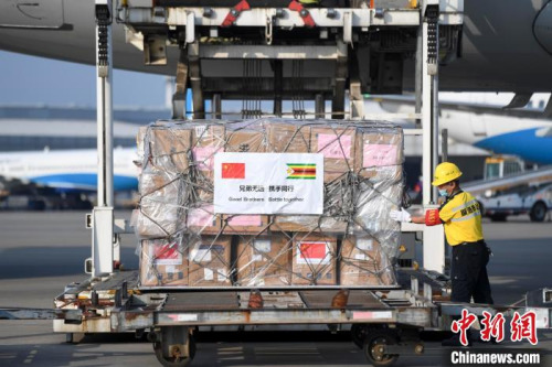 向津巴布韋捐贈的醫(yī)療防護物資裝載上飛機?!钊A峰 攝