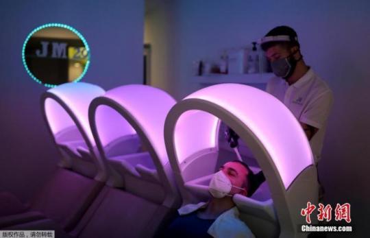 圖為西班牙一家理發(fā)店內(nèi),發(fā)型師為顧客打理頭發(fā)。