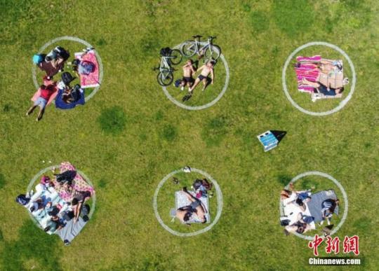 當?shù)貢r間5月24日,美國舊金山市區(qū)的多洛雷斯公園在草坪上畫出數(shù)百個圓圈,以敦促前來休閑娛樂的人們保持“社交距離”。 中新社記者 劉關(guān)關(guān) 攝