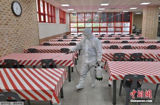 資料圖:當(dāng)?shù)貢r(shí)間5月11日,韓國,首爾一所高中的食堂里,一名身穿防護(hù)服的衛(wèi)生官員正在噴灑消毒劑。