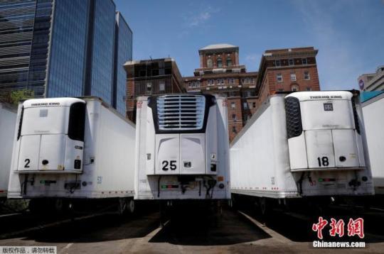 圖為在美國紐約曼哈頓貝爾維尤醫(yī)院附近,冷藏卡車臨時(shí)存放新冠肺炎死亡患者遺體。