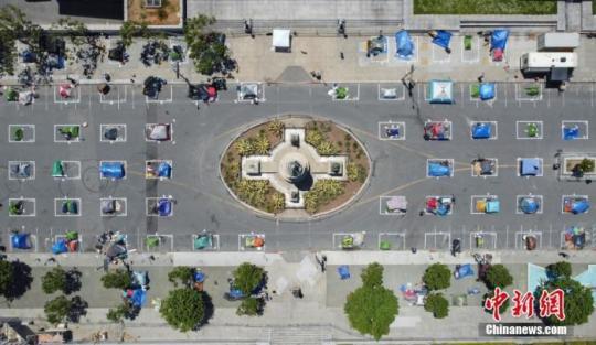 近期,美國舊金山在市政廳對面建起一個無家可歸者營地,并在營地中畫出數(shù)十個方框,確保無家可歸者保持“社交距離”。圖為5月28日航拍該處無家可歸者營地。 中新社記者 劉關(guān)關(guān) 攝
