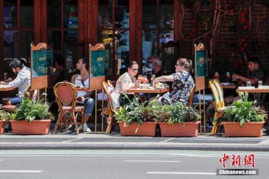 當(dāng)?shù)貢r(shí)間6月22日,紐約曼哈頓一家餐廳,顧客在戶外用餐。當(dāng)日,紐約市按預(yù)定計(jì)劃進(jìn)入第二階段重啟,市政府預(yù)計(jì)將有約30萬(wàn)人重返工作崗位。商場(chǎng)、影劇院、健身房等依然保持關(guān)閉。 中新社記者 廖攀 攝