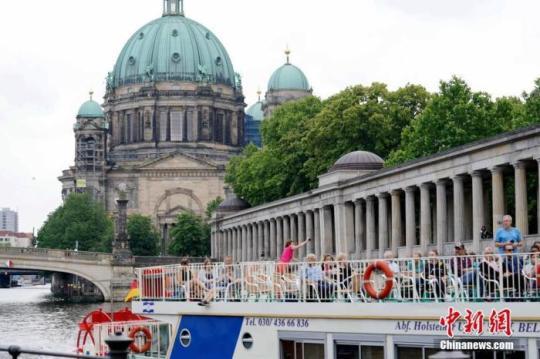 德國(guó)首都柏林著名景點(diǎn)和地標(biāo)建筑之一柏林大教堂日前重新向游客開放。圖為6月12日下午,一艘游船上的游客以柏林大教堂為背景自拍。 中新社記者 彭大偉 攝