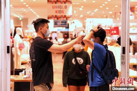 當(dāng)?shù)貢r(shí)間6月24日,加拿大多倫多一購物中心內(nèi),商家為入店顧客逐一測量體溫。 中新社記者 余瑞冬 攝