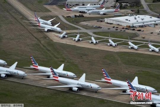 當(dāng)?shù)貢r間3月23日,在美國俄克拉荷馬州塔爾薩國際機(jī)場,美國航空公司的客機(jī)擁擠在一條跑道上。