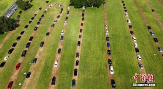 當(dāng)?shù)貢r間7月15日,美國佛羅里達(dá)州,當(dāng)?shù)厝碎_車排長隊等待接受新冠病毒檢測。