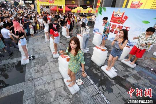 7月25日,湖南高溫天氣持續(xù),長沙黃興路舉辦站冰塊吃辣條挑戰(zhàn)賽,為市民們解暑去熱。比賽規(guī)定5分鐘時間內(nèi),選手赤腳站在冰塊上吃辣條最多者勝出,從而體驗“冰與火”的刺激。 楊華峰 攝