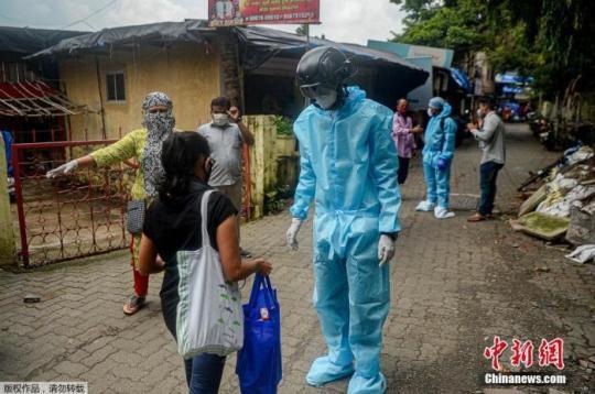 資料圖:當(dāng)?shù)貢r間2020年7月21日,印度孟買,一名非政府組織的衛(wèi)生工作志愿者穿著防護(hù)衣,戴著裝有熱掃描傳感器的智能頭盔在居民區(qū)挨戶查看居民體溫。