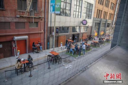 當(dāng)?shù)貢r(shí)間8月8日,美國加州舊金山一家餐廳在門口的停車位上擺放了數(shù)張餐桌,供食客就餐。中新社記者 劉關(guān)關(guān) 攝