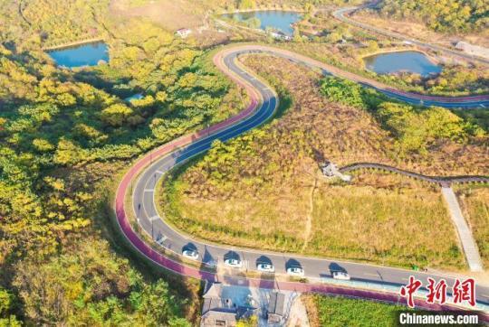 航拍下的安徽肥東峴山村秋色,整潔的盤山公路延綿遠(yuǎn)方,蔥郁的植被遍布山崗?!№n蘇原 攝