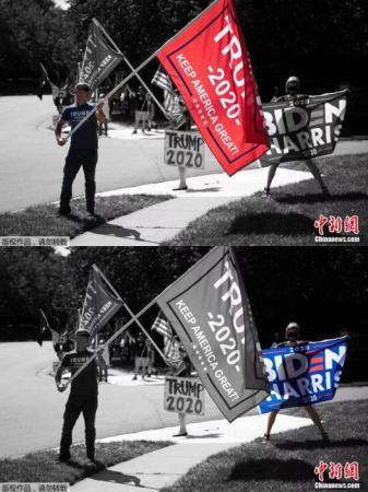 2020年美國(guó)總統(tǒng)大選“由紅翻藍(lán)”,民主黨人拜登勝選,2021年將入主白宮。圖為特朗普和拜登支持者揮舞各自的集會(huì)旗幟。