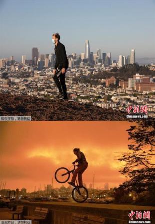 資料圖:美國(guó)加州在新冠疫情陰霾下,又燃起山火,城市天空變?yōu)槌壬跋笕缒┤针娪啊?/p>