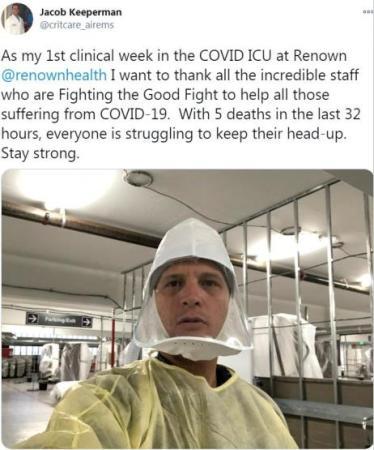 圖為美國(guó)新冠急救醫(yī)生雅各布 基伯曼的自拍照。(圖片來源:雅各布 基伯曼社交網(wǎng)絡(luò)截圖)