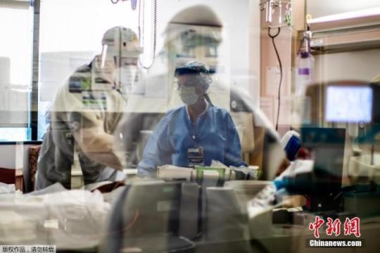 圖為美國加州一重癥監(jiān)護病房內(nèi),醫(yī)護人員正在治療病患。