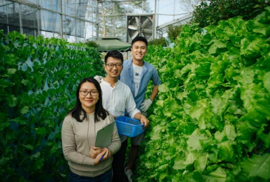 三位90后創(chuàng)始人在蔬菜大棚里合影