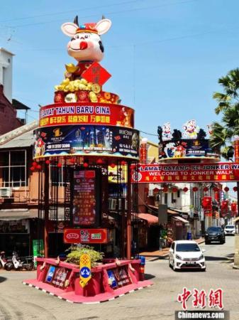2021年2月,高達(dá)4米多的“財(cái)神爺”裝扮的開運(yùn)牛像樹立在馬來西亞馬六甲市雞場街街口,為這一世界文化遺產(chǎn)地添加節(jié)慶氣氛。中新社發(fā) 雞場街文化坊 供圖