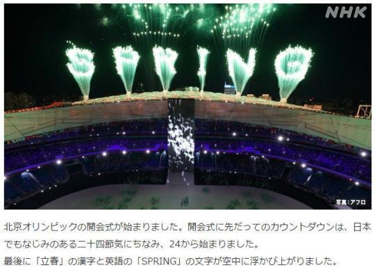 日本放送協(xié)會(huì)(NHK)也特意提到了這一創(chuàng)意,稱(chēng)“倒計(jì)時(shí)從‘24’開(kāi)始,采用了在日本也很熟悉的‘二十四節(jié)氣’,最后空中(還)出現(xiàn)了‘立春’的漢字和‘spring’的英文?!?/p>