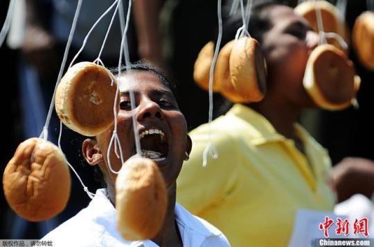 資料圖:斯里蘭卡民眾在慶祝節(jié)日做游戲時(shí),爭相咬細(xì)繩吊起的面包。