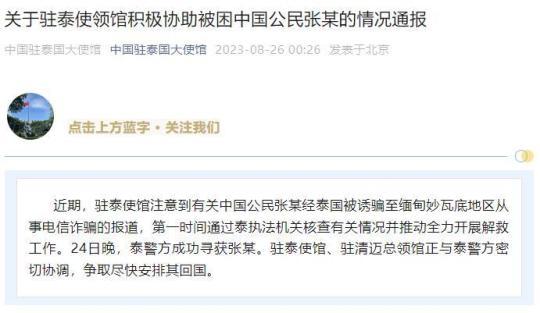 中國(guó)駐泰使館通報(bào):已尋獲張某 爭(zhēng)取盡快安排其回國(guó)