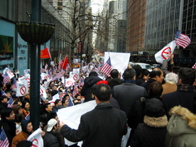 這次示威由美東華人社團(tuán)聯(lián)合總會發(fā)起組織,獲得大紐約地區(qū)餐館業(yè)積極響應(yīng),新老僑團(tuán)也都紛紛參加。示威人群占據(jù)42街夾第二大道的人行道大約半個街區(qū),手揮美國國旗,群情激昂地高喊“CW11,Say Sorry!”示威者還抬出一個巨大的充氣老鼠,諷刺“芥蘭鼠”乃子虛烏有。示威者在現(xiàn)場奏美國和中國國歌,氣氛相當(dāng)熱烈。