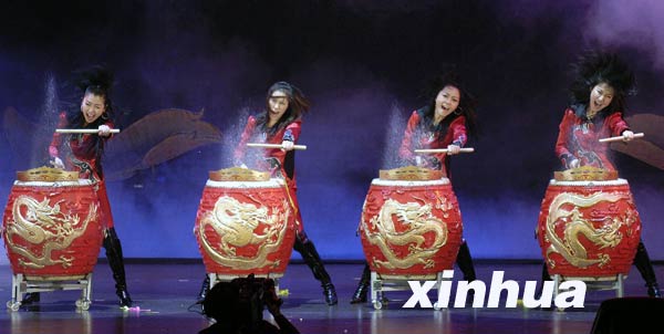 | 1月28日,“紅櫻束”女子打擊樂團(tuán)在美國洛杉磯的帕薩迪納大劇院舉行的“2007北美春節(jié)聯(lián)歡晚會(huì)”上表演打擊樂《中國龍》。(新華社記者戚恒攝) |