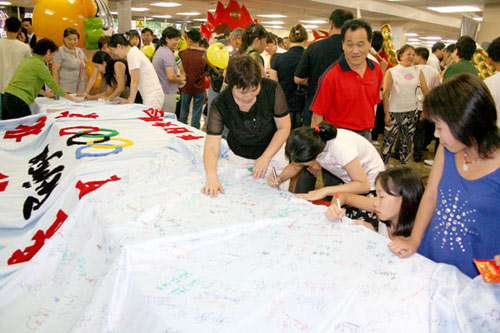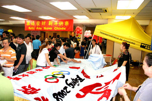 中國(guó)僑網(wǎng)消息:據(jù)巴西僑網(wǎng)報(bào)道,由巴西中華婦女聯(lián)合會(huì)成員一針一線制做的絨繡奧運(yùn)長(zhǎng)卷于2月10日正式亮相,當(dāng)天巴西三千僑胞歡聚在圣保羅安年比會(huì)議中心,觀看中國(guó)藝術(shù)團(tuán)圣保羅慰?jī)S演暨2008年全僑春節(jié)聯(lián)歡晚會(huì),婦女會(huì)將絨繡奧運(yùn)長(zhǎng)卷擺在在會(huì)場(chǎng)入口處,讓參加當(dāng)天晚會(huì)的中國(guó)駐巴西大使陳篤慶、圣保羅總領(lǐng)事陳榮茂、巴西旅游部長(zhǎng)瑪爾塔以及僑胞一千多人在絨繡奧運(yùn)長(zhǎng)卷上簽字。