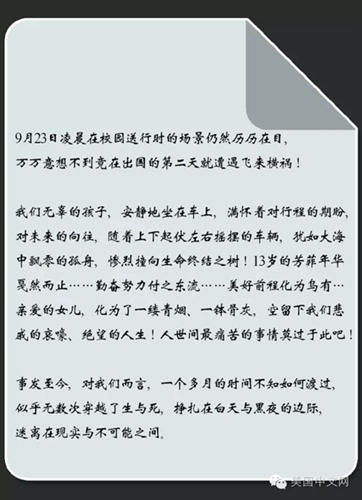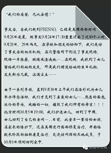 中國(guó)僑網(wǎng)10月28日電 據(jù)美國(guó)中文網(wǎng)報(bào)道,當(dāng)?shù)貢r(shí)間10月28日,美國(guó)中文網(wǎng)駐舊金山記者的郵箱收到了一封來(lái)自9月23日加州旅行巴士事故中遇難女孩父親的信。這位父親在信里直面?zhèn)?,飽含了?duì)女兒的思念,也有他對(duì)女兒逝去的追責(zé)。它很好的詮釋了,面對(duì)事故,一直想要的“追究”到底是為了什么。