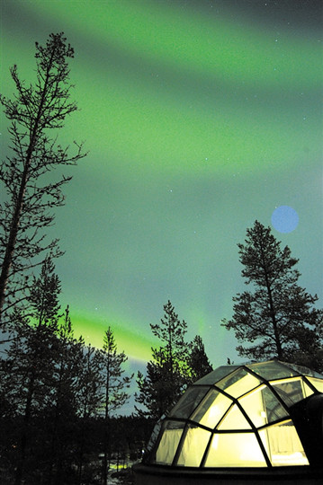 在拉普蘭欣賞極光,大多是在雪域森林中。森林中樹木不高,不會影響觀賞視線,還能讓極光景色更豐富。而最特別的是一排排森林玻璃穹頂小屋,即使室外溫度低至-30℃,也可以舒適地躺在溫暖的床上,透過玻璃觀測閃爍在晴朗夜空中的極光和璀璨的星河。當然,也可以穿上專業(yè)雪地靴,到野外“零距離”追極光。