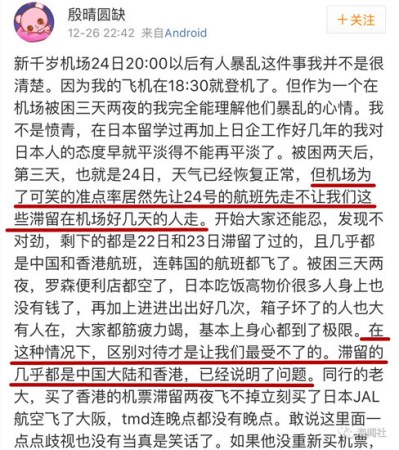 疑問三:中國旅客遲遲無法登機,是因為受到了日本的歧視?