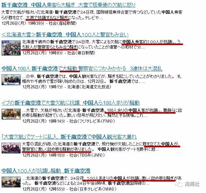 發(fā)現(xiàn)幾乎所有主流媒體(包括《產(chǎn)經(jīng)新聞》、《每日新聞》、富士電視臺、TBS電視臺等)的措辭都是“中國人抗議航空公司”“與警察發(fā)生沖突”“引起騷動”“互相推搡”。點開每條看,并未使用詆毀中國人的措辭。