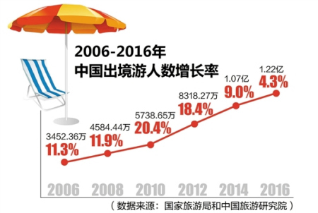 2017年春節(jié)假期,615萬國人到世界各地歡度新春佳節(jié),創(chuàng)出了出境游歷史新高,引來世界矚目。實(shí)際上,早在2011年,中國已成為世界第一大客源國,2014年出境游人次首次破億,2016年更是達(dá)到了1.22億人次。這一數(shù)字相當(dāng)于我國人口數(shù)量前七位的重慶、上海、北京、成都、天津、廣州、保定的總和,也接近目前日本的總?cè)丝跀?shù)。