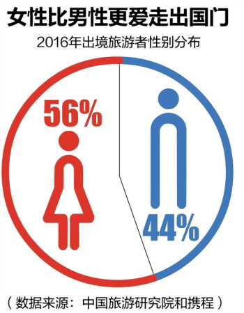 而在性別上,女性比男性更愛走出國門。中國旅游研究院和攜程的報(bào)告顯示,根據(jù)在線出境游的性別、年齡統(tǒng)計(jì),2016年出境旅游者中,56%是女性,44%是男性,女性比例高12個百分點(diǎn)。