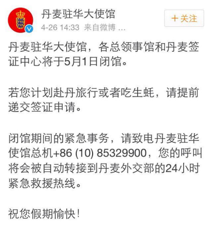 26日下午,大使館公布勞動節(jié)閉館消息,特意提醒“計劃赴丹吃生蠔的朋友請?zhí)崆斑f交簽證申請”!