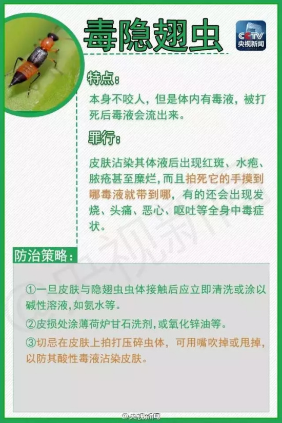 蜱蟲、恙蟲、隱翅蟲……這些蟲子體型小,卻毒性“殘暴”。該如何辨別自己是否“中招”?又該怎樣正確處理?看下圖,告訴你!