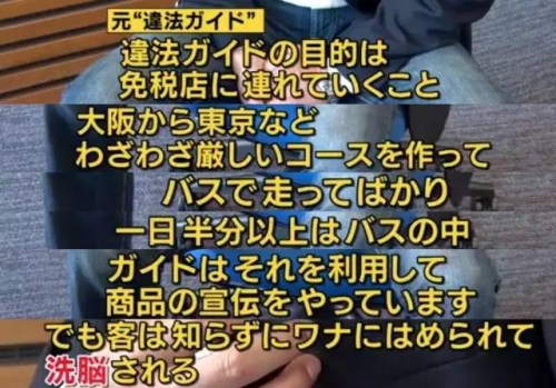 “黑導(dǎo)游的目的就是把客人拉到免稅店,為此他們專門安排從大阪到東京等費時間的路線。這樣客人一天中有半天時間在大巴里,黑導(dǎo)游利用這些時間進行虛假宣傳。于是客人就在不知不覺中陷入騙局,被洗腦了?!?/p>