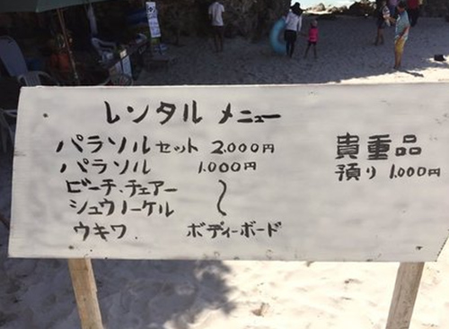 圖為面向日本人的廣告牌(太陽傘套餐組合兩千日元,單租太陽傘、沙灘椅之類的一千日元,保管貴重物品一千日元)