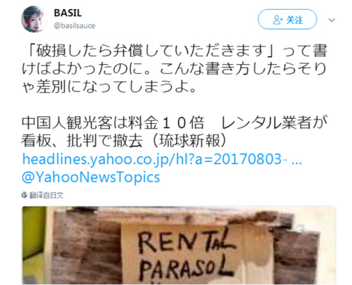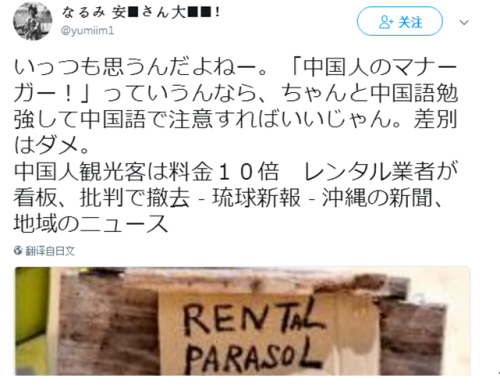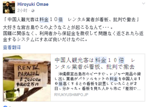 報道說,位在沖繩縣宮古島上的某家海灘用品出租業(yè)者,在出租大陽傘的項目上,竟貼出“中國人要2萬日元(僅限于中國人)”的告示,但其他游客只需付2千日元,隨后被人投訴“歧視”。