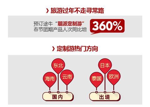 在消費者愈發(fā)注重出游品質的情況下,春節(jié)團期定制出游需求猛增。截至目前,預訂途牛“朋派定制游” 產品的人次相比去年增長了360%,用戶較為青睞的目的地國內方向有海南、云南、東北,出境方向包括泰國、日本、歐洲等。
