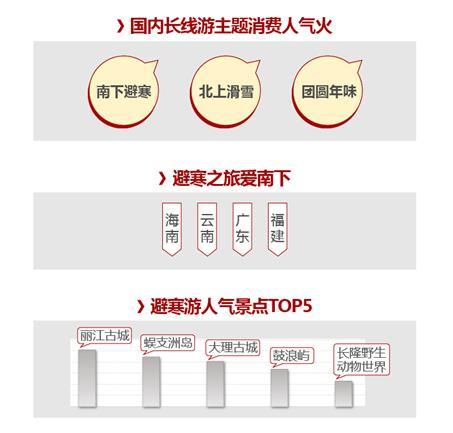 海南、云南、廣東、福建等地溫暖宜人、旅游資源豐富,具體看來,蜈支洲島、麗江古城、大理古城、鼓浪嶼、長隆野生動物世界等景點人氣激增。其中,海南的海島游、包括長隆野生動物世界在內的樂園游等受到較多親子家庭的青睞,預訂出游人次持續(xù)上漲。值得一提的是,與北方相比,云南春季回暖較早,2月份還可以去羅平看油菜花,“春城”昆明也處于最宜人的季節(jié),讓眾多用戶心動不已,紛紛預訂春節(jié)期間相關旅游產品。