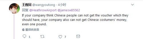 網(wǎng)友王攸同:如果你們認(rèn)為中國人不配拿到優(yōu)惠券,那么貴公司同樣也掙不到中國人的錢,一磅也別想。