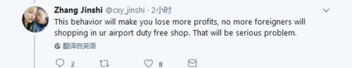 網(wǎng)友Zhang Jinshi:這樣的行為會(huì)讓你失去更多效益,外國人(非英國人)可能不會(huì)再去你們的免稅店。這就很嚴(yán)重了。