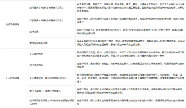 意外及醫(yī)療保障,救援服務(wù),旅行不便保障,個(gè)人財(cái)務(wù)保障以及個(gè)人責(zé)任保障等。