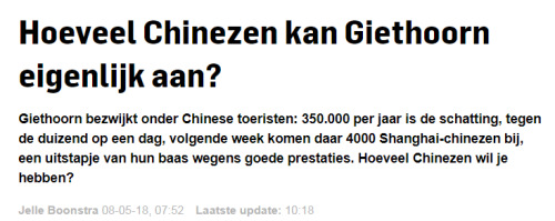 坐在自家窗口的Nick Altena表示,自己整天瞅著窗外名叫Binnenpad的路上,走過(guò)一群又一群的中國(guó)人?!半m然這4000名中國(guó)游客分成了10個(gè)旅游團(tuán),但400人的團(tuán)依然龐大。這種公司組織的旅游團(tuán)如果來(lái)得更多,結(jié)果會(huì)到什么地步?”
